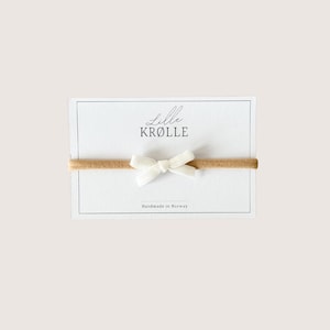 Nydelig beige bomullssløyfe. Perfekt for både liten og stor. Velg mellom tre forskjellige størrelser. Festes med antiskli-spenne eller mykt hårbånd (for baby).